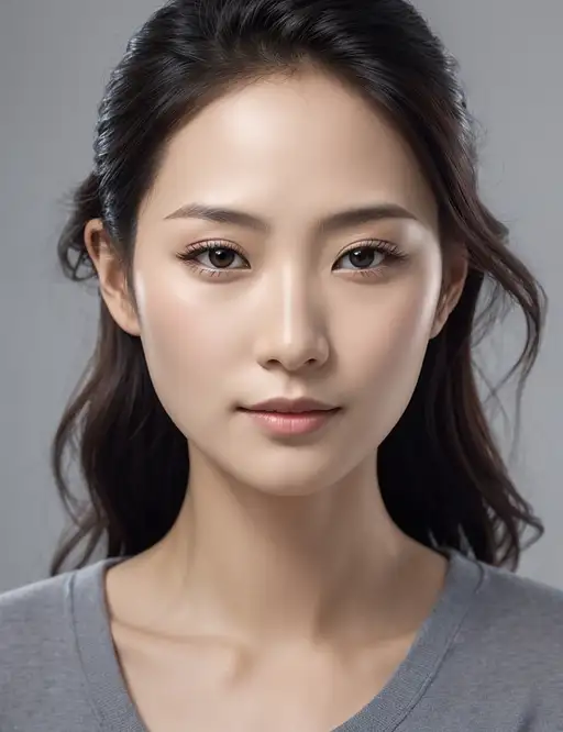 almost 2 years ago an asian woman with long hair wearing a gray shirt, a photorealistic painting by Lü Ji, trending on cg society, photorealism, studio portrait, uhd image, pretty elielborges 0 88