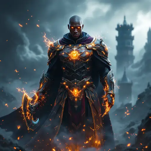 6 months ago Ultra-photorealistic cinematic portrait of Mahershala Ali as the Shatterborne Saint. His armor is forged from the ruins of broken heavens, glowing with fractures of divine wrath. Each plate bears the seal of a forgotten god. His eyes blaze like the moment of impact—gold, red, and blinding. Storms swirl behind him: electric winds, celestial fire, and ash rain. His cape is stitched from banners of fallen nations. In one hand, he holds a thunder-wracked relic axe carved from a slain titan’s spine; in the other, a burning gauntlet shaped from collapsed suns. Behind him, shattered citadels float in a gravityless void. Intense high-contrast lighting, epic scale, 4K ultra-definition, IMAX format, filmed through storm-filtered lens, tone: cataclysmic glory. etox 0 35