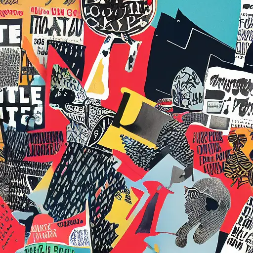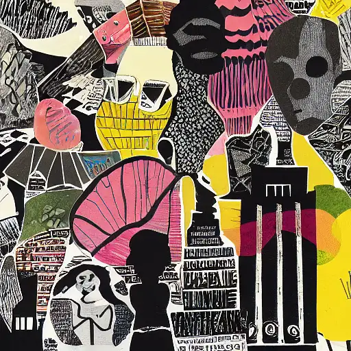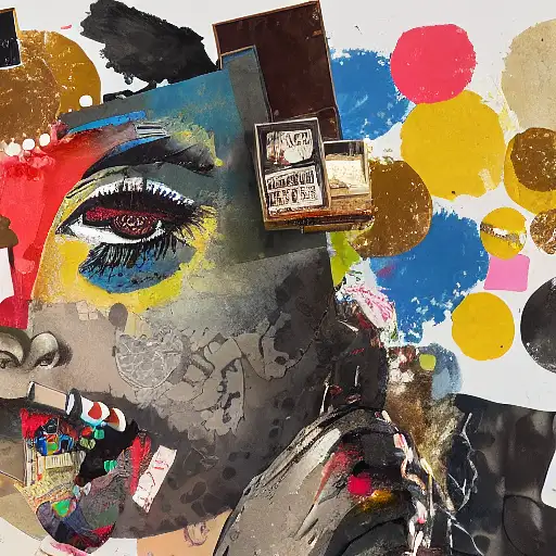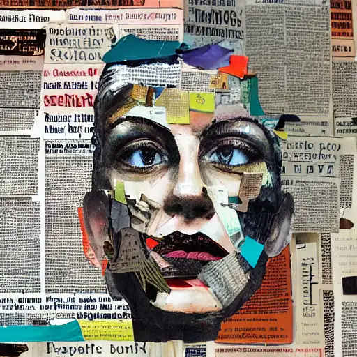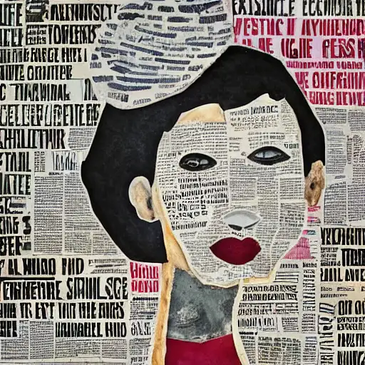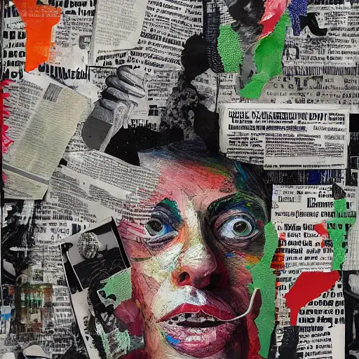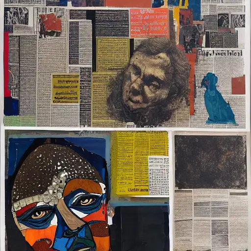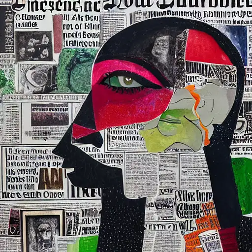 almost 3 years ago expressive gouache and ink illustration, editorial illustration! content for political opinion article, new york times illustration, cluttered maximalist, rauchenburg, impasto paint, 3d elements, dark tones, editorial illustration award!! contrast between large photocopy of face close up and other collage pieces with ripped headlines from newspapers ewit 0 150