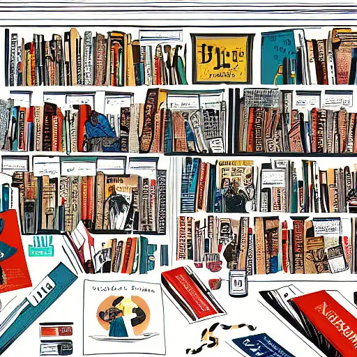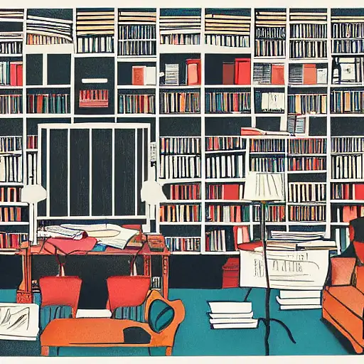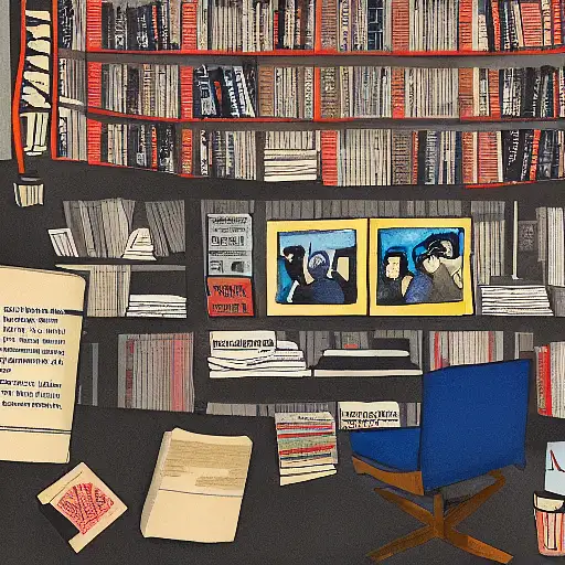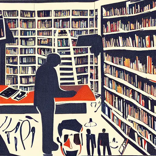 almost 3 years ago expressive gouache and ink illustration of an editorial content for political opinion article, new york times illustration, interior view, study room library, open shelf layout, cluttered maximalist, dark tones, collage, editorial award ewit 4 610