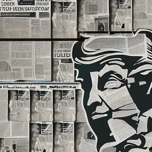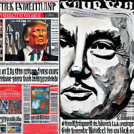 almost 3 years ago expressive gouache and ink illustration, editorial illustration! content for political opinion article, trump political editorial illustration collage style, new york times illustration, rauchenburg, impasto paint, 3d elements, dark tones, contrast between large photocopy of face close up and other collage pieces with ripped headlines from newspapers ewit 0 150