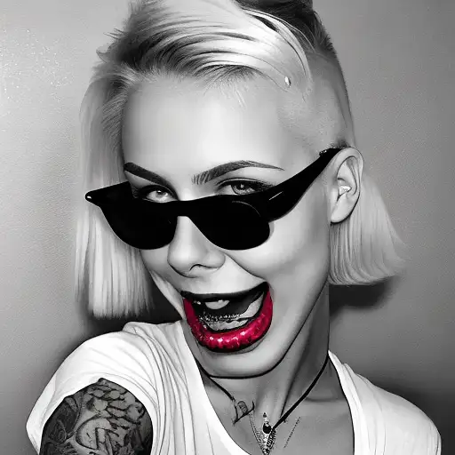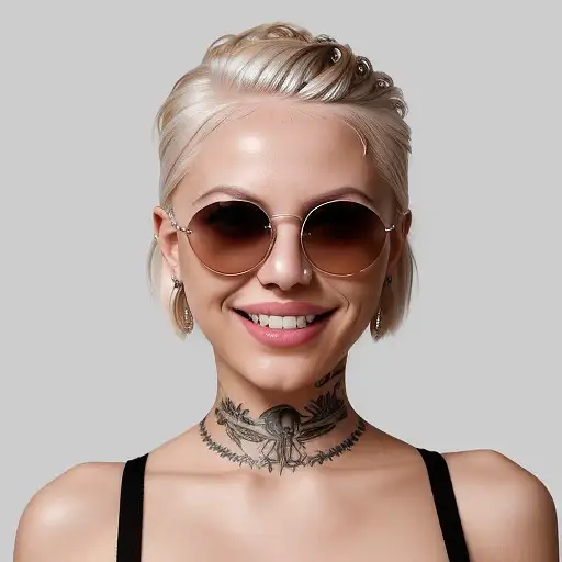 almost 2 years ago A female who has short, platinum blonde hair styled up with sunglasses resting on top of her head. She has a nose piercing and is wearing minimal makeup that highlights her eyes with mascara or eyelash extensions. Her smile reveals white teeth, and she has a visible tattoo on her shoulder, which adds a colorful accent to her appearance. The tattoo appears to be a detailed, multicolored piece that covers her upper shoulder. f077b884c8b 0 79