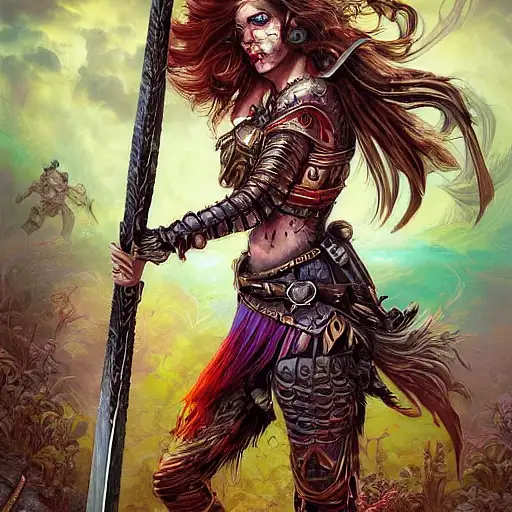 woman, warrior, shield, spear, place of battle, swords stuck in the ground, skulls on the ground, highly saturated colors, detailed illustration, digital art, overdetailed art, concept art, full character, character concept, long hair, full body shot, many colors, colorful, all colors, highly saturated colors, Dan Mumford, Peter Mohrbacher, Alfons Mucha, fantasy character, detailed illustration, hd, 4k, digital art, overdetailed art, concept art, trending on artstation