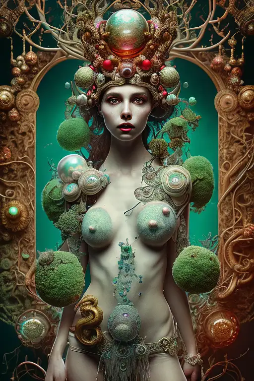 almost 3 years ago photography by Marcin Nagraba, beautiful ornate female god of organic pearls and lace with ornate mushroom crown and outfit of cyberpunk streetwear holding moss and large moths, red and cyan color gel lighting, geometric shadows on face, Alphonse Mucha, details and composition by Rebecca Millen f4cc5231322 0 210
