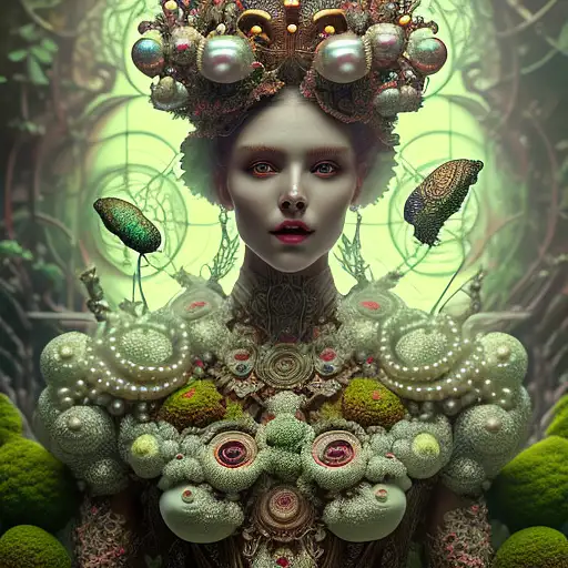 almost 3 years ago photography by Marcin Nagraba, beautiful ornate female god of organic pearls and lace with ornate mushroom crown and outfit of cyberpunk streetwear holding moss and large moths, red and cyan color gel lighting, geometric shadows on face, Alphonse Mucha, details and composition by Rebecca Millen f4cc5231322 0 120