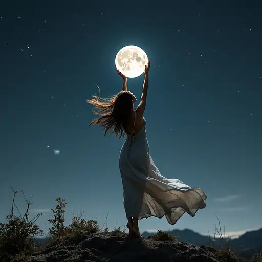 8 months ago low angle photograph of a woman, standing on top of a small mountain, hands in the air holding up the full moon late at night, long brunette hair, loose flowing spaghetti strap dress, hair and dress blowing in the wind, cler sky f818f06da6f 0 58