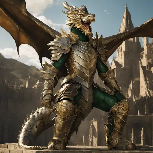 2 years ago a dragon stands tall and majestic, its formidable presence enhanced by the magnificent suit of armor it wears, the armor is a work of art crafted with meticulous detail and designed to blend strength and beauty seamlessly, the dragon's scales, normally shimmering with hues of emerald and gold, are now partially concealed beneath the armor, the armor itself was forged from a combination of burnished steel and gleaming mithril, creating a mesmerizing contrast against the dragon's natural scales, the steel sections are resilient and impenetrable, meanwhile the mithril components add a touch of elegance, glimmering in the sunlight with an otherworldly iridescence, 8K resolution, HD, fantasyfreak22 1 170