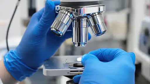8 months ago Close-up photograph of a pair of hands wearing blue latex gloves, using a microscope to examine a small, rectangular sample. The microscope is made of metal and has a shiny, reflective surface. The hands are focused on the microscope, with the sample centered in the frame. The background is out of focus, but it appears to be a laboratory setting with white walls and equipment. The lighting is bright and even, highlighting the details of the microscope and the sample. The overall tone is sterile and professional, with a focus on scientific research and precision. fb2e9a74f36 0 31