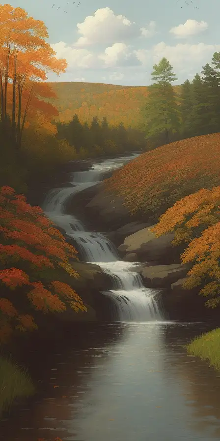 11 months ago a hyper-realistic painting in the style of Winslow Homer featuring a meadow in Autumn, low angle, 4k, true colors, some puffy clouds and trees changing colors to fall. A water course can be seen snaking through the trees here and there. A small flock of birds fly over fairly close. fefe5e50b28 π 1 30