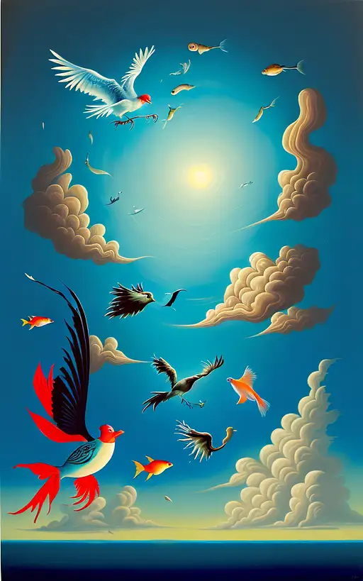 11 months ago a surrealist painting of a bird flying underwater and a fish flying through the clouds. fefe5e50b28 π 0 20