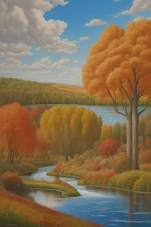 11 months ago a hyper-realistic painting in the style of Renoir featuring a French meadow in Autumn, mid-angle, 4k, true colors, some puffy clouds and trees changing colors to fall. A water course can be seen snaking through the trees here and there. fefe5e50b28 π 0 23