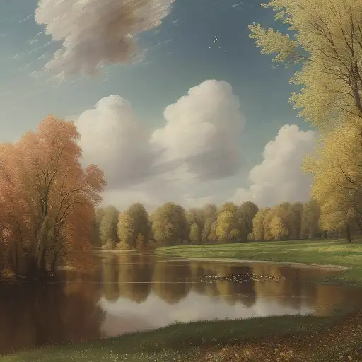 11 months ago a hyper-realistic surrealist painting in the style of John Constable featuring a meadow in Autumn, high angle, 4k, bismuth colors, some puffy clouds and trees changing colors to fall. fefe5e50b28 π 0 15