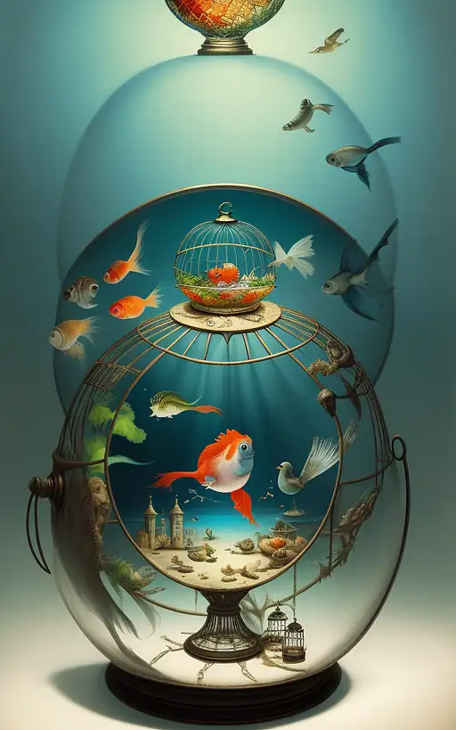 11 months ago A fish is in a birdcage and a bird is in a fishbowl in this surrealist painting. fefe5e50b28 π 0 12