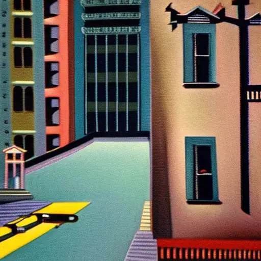 11 months ago a surrealist painting of a mostly deserted new york street in the 1930's where a man is heading to work but instead of a head he has a television (which hadn't been invented yet) and on the screen is him, in color. fefe5e50b28 π 0 28