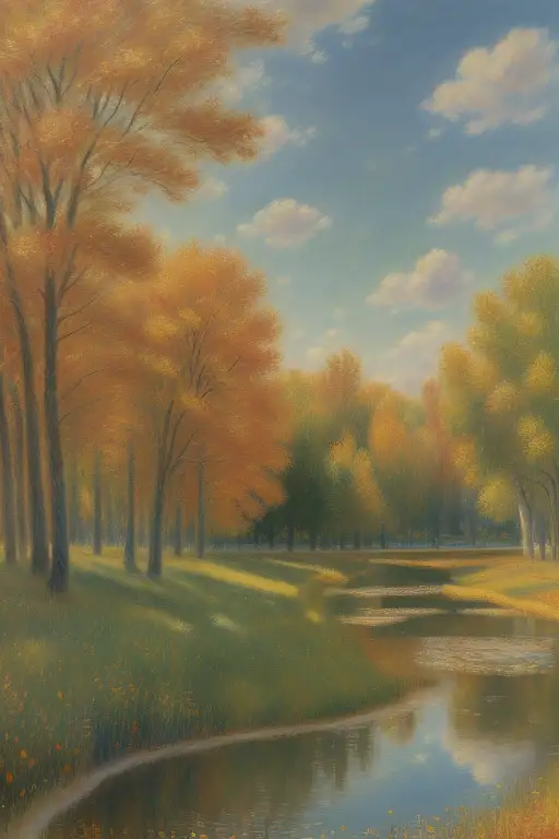 11 months ago a hyper-realistic painting in the style of Renoir featuring a French meadow in Autumn, mid-angle, 4k, true colors, some puffy clouds and trees changing colors to fall. A water course can be seen snaking through the trees here and there. fefe5e50b28 π 1 30