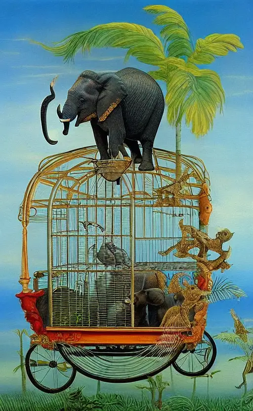 11 months ago a surrealist painting of a elephant pulling a birdcage in a wagon. In the birdcage are very pretty tropical fish. fefe5e50b28 π 0 27