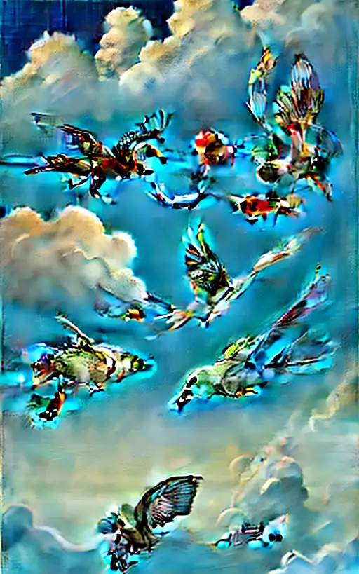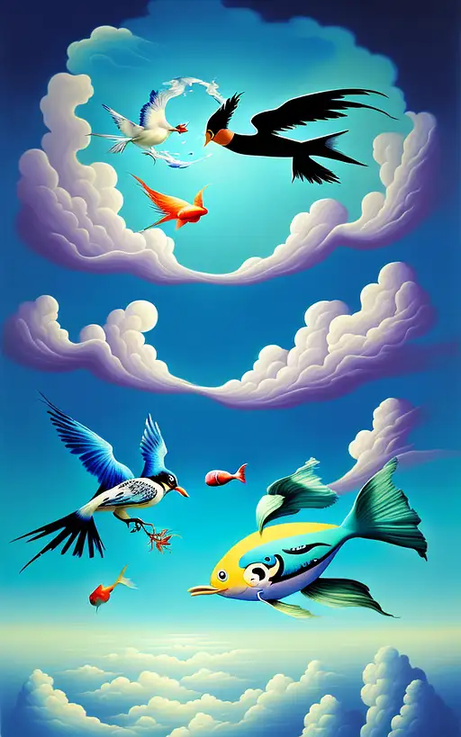 11 months ago a surrealist painting of one bird flying underwater and one fish flying through the clouds. fefe5e50b28 π 0 24