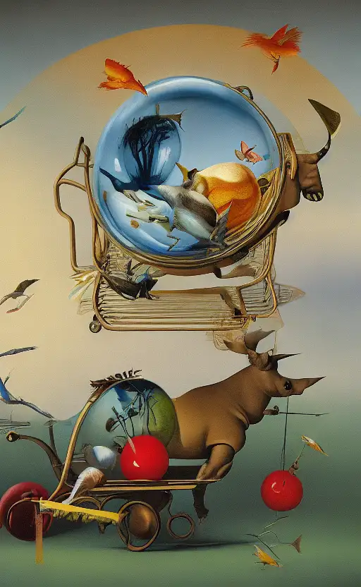 11 months ago a surrealist painting of a rhinoceros pulling a large fishbowl in a cart. In the fishbowl are softly colored finches flitting about. 4k resolution. fefe5e50b28 π 0 31