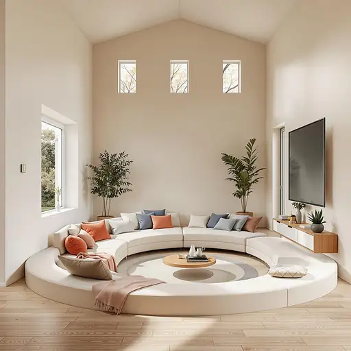 7 months ago High resolution photography interior design, dreamy sunken living room conversation pit, wooden floor, small windows opening onto the garden, bauhaus furniture and decoration, high ceiling, beige blue salmon pastel palette, interior design magazine, cozy atmosphere; 8k, intricate detail, photorealistic, realistic light, wide angle, kinkfolk photography, A+D architecture finnix 0 37