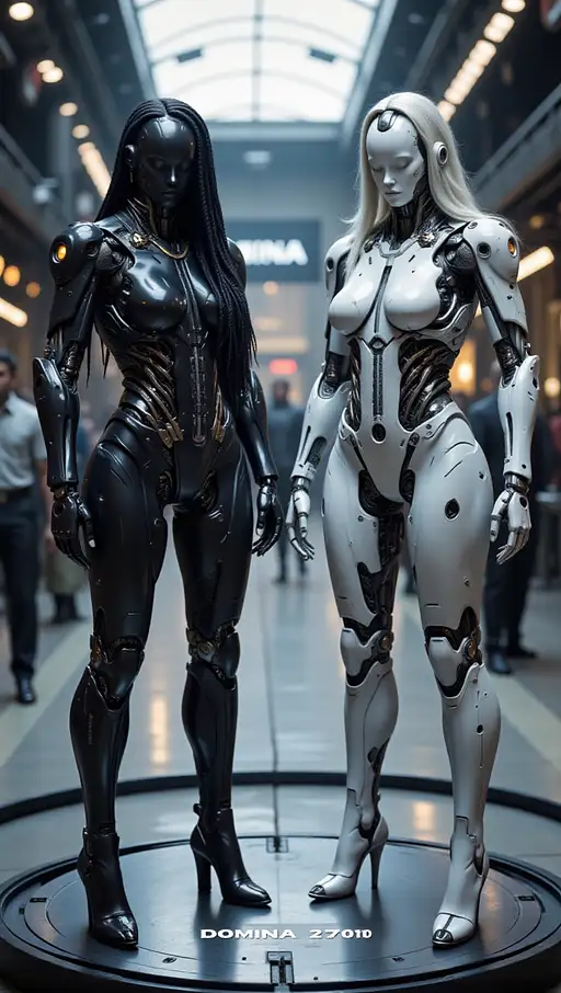 6 months ago cyborg, exosuit, mech, two people, stand on a metal pedestal with a sign \"Domina 27010\" in a shiny futuristic showroom display. One beautiful black cyborg with a black female face, braided hair, female torso, curvy, robotic legs. One beautiful white cyborg with a white female face, long hair, female torso, curvy, robotic legs. Cinematic photo still, translucent, detailed, ethereal atmosphere, hyperrealistic,8k fotoeffex 0 120