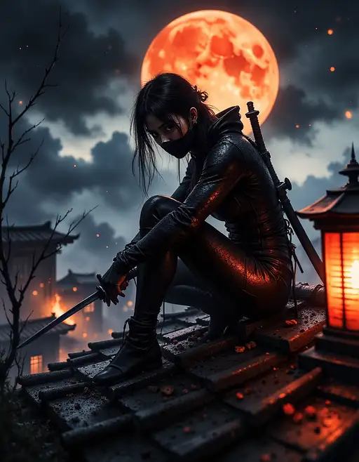 4 months ago ral-ertmsphr. Low angle, Full body photo of a Japanese Female Ninja assassin crouches on a rooftop of a Japanese village at night. Dark clouds and a red moon behind her. Burning houses in background, Embers from the fires fall from the sky. She looks down at the camera. She is cool and dangerous as the night, she blends into the background, only her narrow eyes are visible. She is lit by the light of an orange roof lantern that reflects off her suit and face highlighting her dynamic form. She wears a futuristic black stealth suit from head to feet with a scale-like pattern. The suit covers her neck and lips, only her eyes are visible. The suit is reinforced by protective padding on her shoulders, elbows, hips and knees. Soft black knee high boots make her step quietly. She carries a Katana on her shoulder. The skin tight suit hugs her sleek figure. The orange light emphasizes her shape. She is silent , graceful and deadly, barely visible in the dark of night. Detailed, hyperrealistic,8k fotoeffex 0 26
