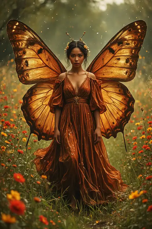 2 months ago immaculate fantasy image of a beautiful angel with giant brown and gold butterfly wings. She has a light brown skin tone that is a mix of ethnicities, likely Asian and Black. She has tiny gold antennae on her head. She has gorgeous brown eyes. She wears an elegant full length gown the color of the butterfly wings. She walks in a garden of red and yellow flowers. Her feet in the wet grass. Background: bokeh, a garden of red and yellow flowers. Intricate, High Detail, Sharp focus, dramatic, photorealistic, 8k fotoeffex 0 20