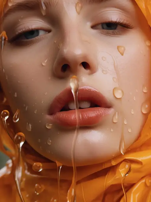 over 2 years ago the model is wearing orange colored lipstick and mascara, in the style of marilyn minter, animated gifs, macro photography, yigal ozeri, monochromatic serenity, light beige and light amber, wavy resin sheets 32k, light brown and light amber, Fujifilm X-T4, Sony FE 85mm f/1.4 GM --ar 93:125 --q 2 --s 750 --style raw --v 5.1 --s 750 freakyAI 11 810