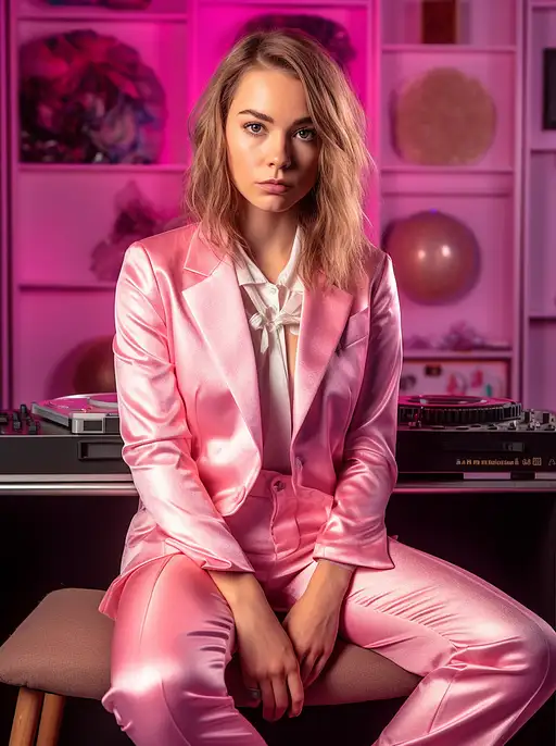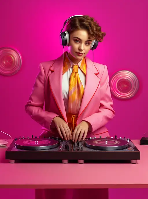 over 2 years ago commercial portrait a woman in pink suit djing on the mixing table, in the style of natalia drepina, bold curves, video, miwa komatsu, yigal ozeri, mashup of styles, pure color --ar 65:87 --s 750 --style raw --v 5.1 freakyAI 8 240