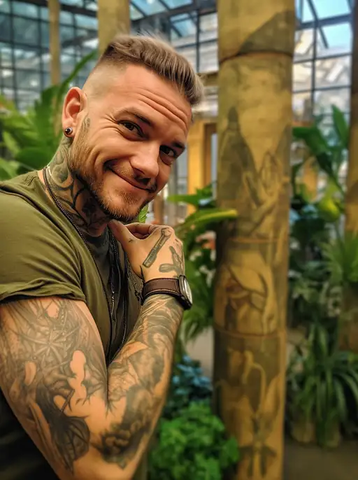 over 2 years ago selfie of a male with a tattoo on one arm smiling as he takes a picture, in the style of cryengine, enigmatic tropics, site-specific work, green and brown, the helsinki school, neo-academism, photo-realistic --ar 119:160 --q 2 --s 750 --style raw --v 5.1 freakyAI 4 320