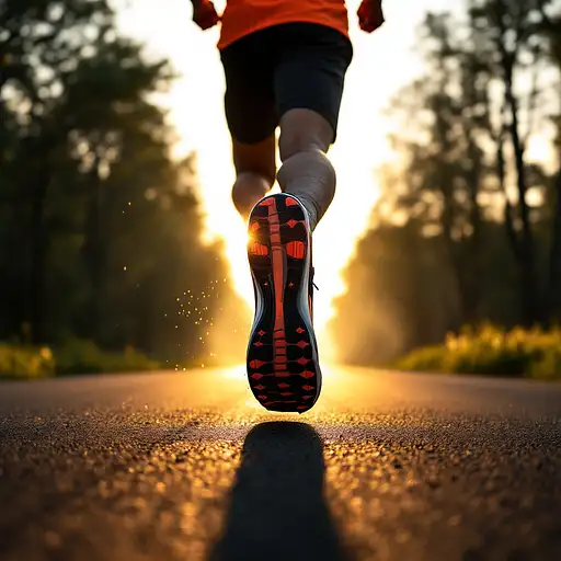 10 months ago "A fit man running on the road, rear low perspective focusing mainly on the shoes and legs, in a realistic style. Medium shot showing from the waist down, during sunrise with soft light. Emphasis on the sensation of speed and dynamism, with the reflection of the sunrise on the shoes. The man is wearing black sportswear, a brightly colored shirt, and Nike shoes. Technical details: wide-angle lens, soft sunrise lighting, high resolution, sharp focus on shoes and legs." golfotango 0 57