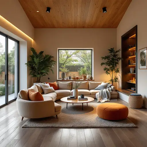 10 months ago High resolution photography interior design, dreamy sunken living room conversation pit, wooden floor, small windows opening onto the garden, bauhaus furniture and decoration, high ceiling, beige blue salmon pastel palette, interior design magazine, cozy atmosphere; 8k, intricate detail, photorealistic, realistic light, wide angle, kinkfolk photography, A+D architecture golfotango 0 58