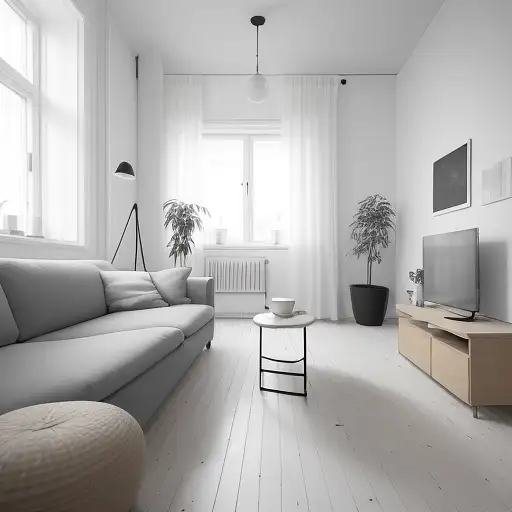 2 years ago interior design, scandinavian style, scandinavian design, white style, living room, modular furniture with cotton textiles, wooden floor, low ceiling, large steel windows viewing a city, carpet on the floor, minimalism, minimal, clean, tiny style, accent bright color, air, eclectic trends, gray, simple and functional golfotango 1 90