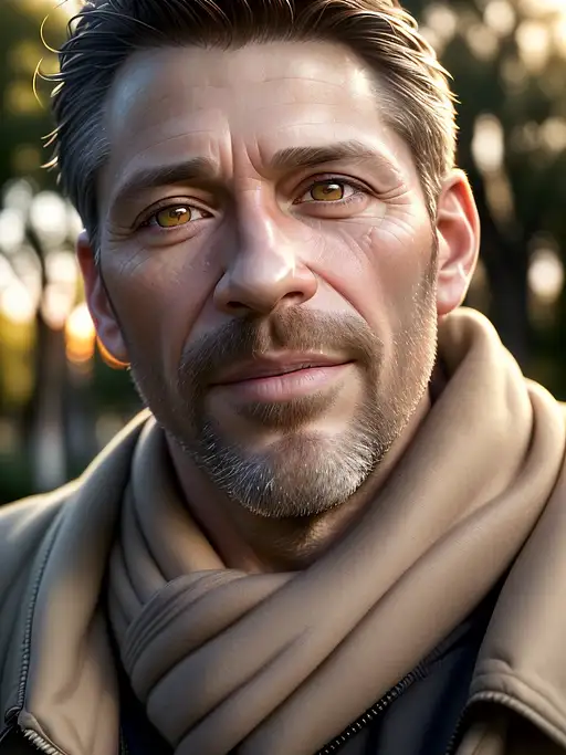 2 years ago "Hyper-realistic detailed portrait of a 40 yo man, in a warm urban park setting during a sunset. Emphasize contrasts of light and shadow to bring out facial details. Be sure to capture the highlights in the eyes for a lively look. Add subtle wrinkles and skin textures for enhanced realism Pay special attention to lip texture and gloss for a natural look. Incorporate natural elements such as trees and flowers in the background to complement the story of the portrait, Resolution: 3000x4000 pixels, Camera type: High-resolution digital SLR Lighting: Natural light source with soft diffused light to minimize harsh shadows, Depth of field : Sharp focus on the face, with soft background blur." golfotango 0 100