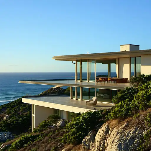 10 months ago Hyper realistic eye level exterior photo of a mid century modern style house overlooking the ocean, daylight, indirect lighting, AD magazine, Frank Lloyd, Eames, Mies van der Rohe golfotango 0 43