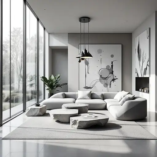 9 months ago A modernist living room with floor-to-ceiling windows, allowing natural light to flood the space. The furniture is ultra-minimalist, featuring bold geometric shapes and avant-garde materials like raw concrete, glass, and polished metal. A sculptural, monolithic sofa with sharp edges dominates the space, paired with an abstract coffee table made of asymmetrical stone slabs. The color palette is monochromatic, with subtle textures adding depth. A statement lighting fixture, resembling an industrial art piece, hangs from the ceiling. The walls are adorned with large-scale abstract artwork, and the overall ambiance is sleek, experimental, and futuristic. goodnightdanil 0 48