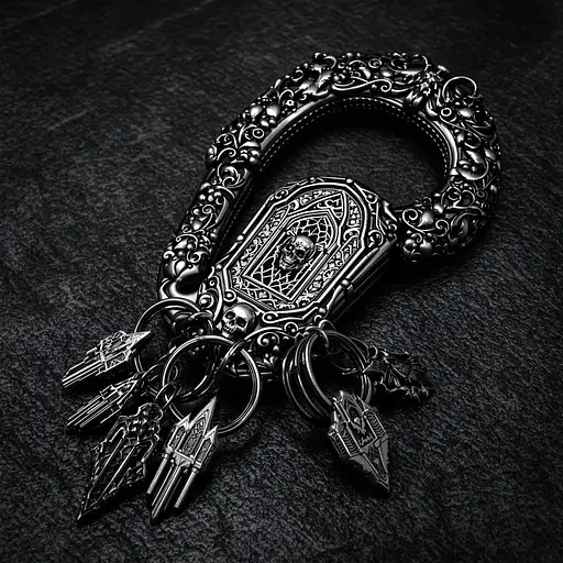 9 months ago A gothic-inspired key organizer designed as an elegant metallic carabiner, intended to be attached to a belt or pant loop. The carabiner is adorned with intricate neo-gothic patterns: pointed arches, ornate engravings, and delicate metal latticework. The central part of the carabiner features an engraving or a small relief depicting a skull, bat, raven, or stained glass window. Attached to the organizer are several robust metal key rings, each embellished with decorative elements—miniature gothic spires or wrought iron motifs. The color palette includes dark silver, aged bronze, or blackened metal with a subtle sheen. The background is a textured dark stone or leather surface, enhancing the mysterious ambiance. goodnightdanil 0 21