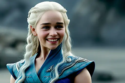 over 2 years ago emilia clarke as daenerys, princess, smiling, of game of thrones, blue dress, hyperrealistic, bokeh, lying on the ground grtmate 0 74