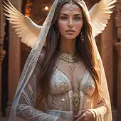 7 months ago Queen Dihya stands gracefully in the golden embrace of the sun, her breathtaking gown of shimmering diamonds and sapphires glowing like celestial light. Framed by the grandeur of an intricately designed Algerian castle, she stands amidst the lush, blooming nature of Algeria, where vibrant blossoms and cascading vines thrive. The warm sunlight kisses her porcelain-white skin, illuminating her radiant beauty as the wind plays with her flowing hair. Every detail, from the castle’s intricate carvings to the dazzling landscape, harmonizes in a mesmerizing display of elegance, making her a vision of timeless grace and regal splendor. hakmdzzz 0 94
