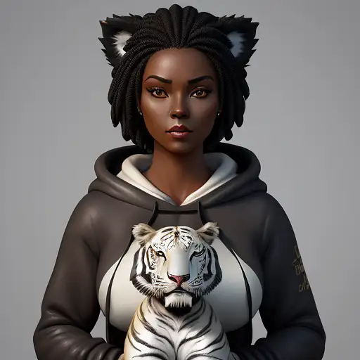 2 years ago a statue of a woman dark skin, african american female holding a white tiger, an airbrush painting, trending on zbrush central, black haired girl wearing hoodie, closeup character portrait, very stylized character design, lioness 39501b5968a 1 93