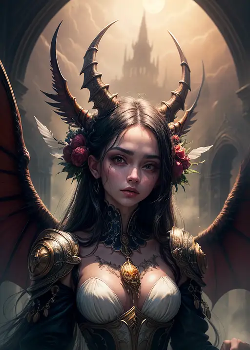 2 years ago (best quality, 8k, masterpiece:1. 2), close up portrait, sharp focus, alluring demon, ethereal beauty, perched on a cloud, fantasy illustration, enchanting gaze, captivating pose, delicate wings, otherworldly charm, mystical sky, moonlit night, soft colors, artstation, painting, detailed, vignette, hdr, (close up:1.1), 4k, absurdres, <lora:add_detail_44319:1> ArtEnthusiast 6 170