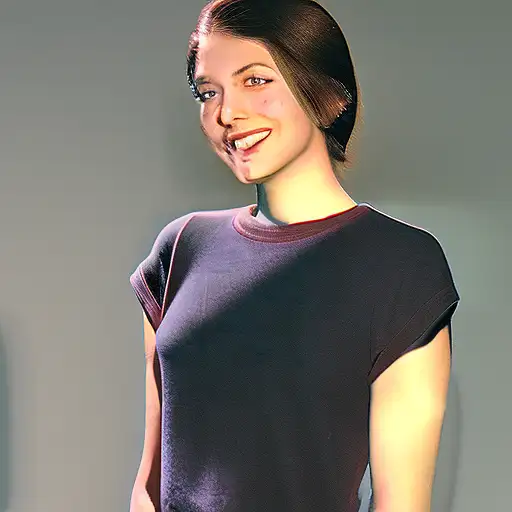 over 1 year ago An image of a young woman with a medium complexion and chestnut-colored hair styled in a casual updo with loose strands around her face. She has a natural makeup look with defined eyes and a neutral lip color. She is wearing a fitted, cropped burgundy T-shirt with short sleeves and high-waisted black pants with distinctive button details. She stands confidently, with one hand on her hip and the other gently touching her pants. The lighting is soft and frontal, highlighting her features and the texture of her clothing against a muted dark background. hi_o0_0o 0 39