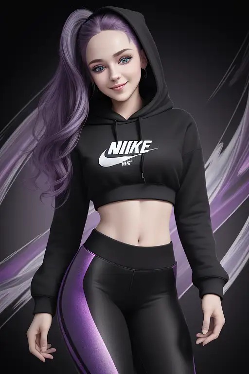 over 1 year ago (8k,ultra hd,high resolution,extreme detail,octane,render,best quality,masterpiece,dynamic angle, highest detailed:1.2),young female,beautiful eyes,(long iridiscent purple hair,smiling:1.2),black hoodie,black leggings,sport sneakers,(Nike logo,abstract background:1.2),fashion pose itsrohit 0 81