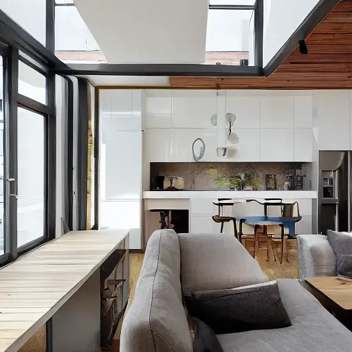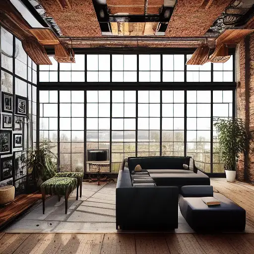 3 years ago interior design, open plan, kitchen and living room, modular furniture with cotton textiles, wooden floor, high ceiling, large steel windows viewing a city 46fc12e5e20 2 660