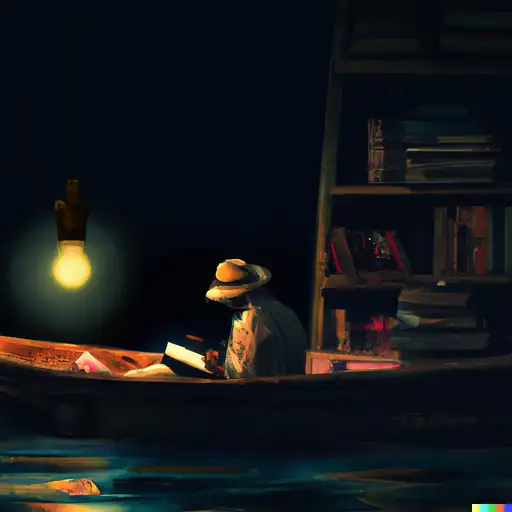 3 years ago a wooden boat drifting in steady ocean at night with a street lamb on it, and a man with straw hat reading book under its light in front a bookshelf full of books DALL-E 1 430