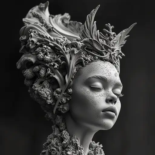 over 1 year ago a black and white sculpture of a woman with an elaborate crown, in the style of hyper-realistic sci-fi, zbrush, detailed nature depictions --v 6.0 Ellrie 19 740