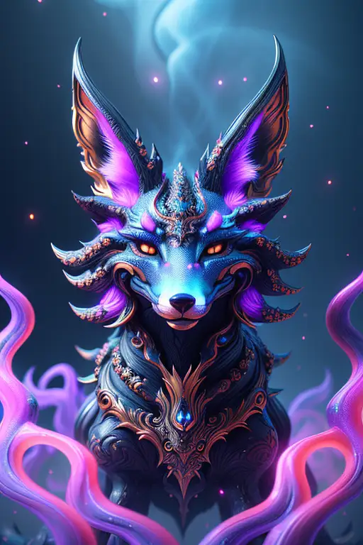 over 2 years ago ornate and intricate mythical fox demon| psychedelic| turbulent fluid| fractal| smokey| symmetrical| sharp focus| vibrant| volumetric fog| studio lighting| depth of field| unreal engine| octane render| raytracing <lora:samdoesartsSamYang_offsetRightFilesize:1> javierjrueda 9 790