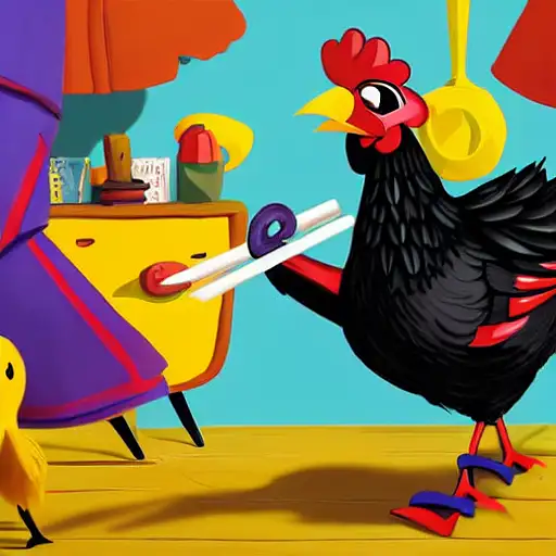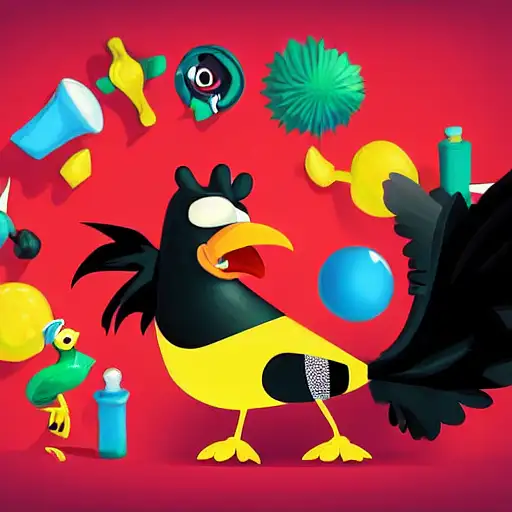 over 2 years ago Cartoon illustration, Pixar-style, anthropomorphic black rooster with a red crest slipping on a stick of butter, surrounded by comical objects and characters, bright and bold color palette, playful lighting casting fun shadows, whimsical atmosphere, low-angle perspective, exaggerated proportions and expressions, aspect ratio 3:4 jmourad 0 96