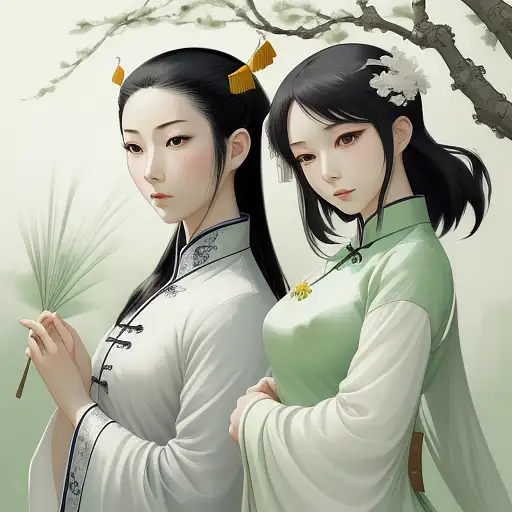 over 1 year ago art print, woman, chinese, in the style of charming anime characters, serene mood, xu beihong, jon j muth, dark white and light green, graceful poses, portraitures --ar 71:128 --stylize 750 --v 6 julian_ai_art 0 44