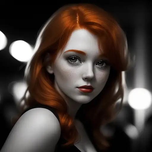 over 1 year ago a flash photography portrait of beautiful ginger haired girl at a party, hyperrealistic film noir julian_ai_art 0 50