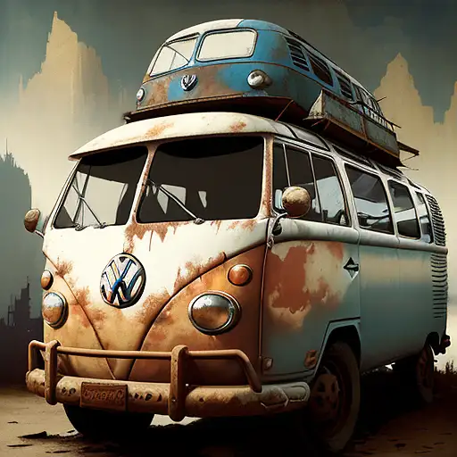 over 1 year ago vw bus, canvas art, abstract art printing, in the style of brian mashburn, light red and light brown, theo prins, charming character illustrations, pierre pellegrini, vintage cut-and-paste, rusty debris --ar 73:92 --stylize 750 --v 6 julian_ai_art 0 42
